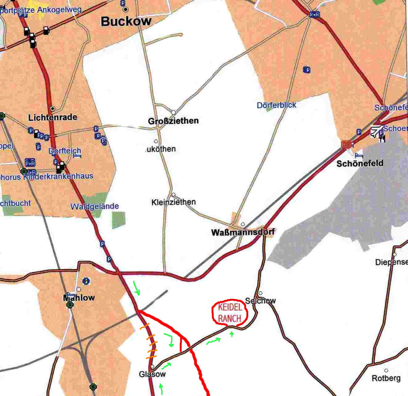 Von Berlin- Lichtenrade aus kommend weiter geradeaus auf der B 96 an der Abfahrt Mahlow/Blankenfelde ausfahren und links in Richtung Selchow abbiegen, ca. nach 2 Kilometern vor der Ortseinfahrt Selchow, linker Hand erreichen Sie unsere Hofeinfahrt.